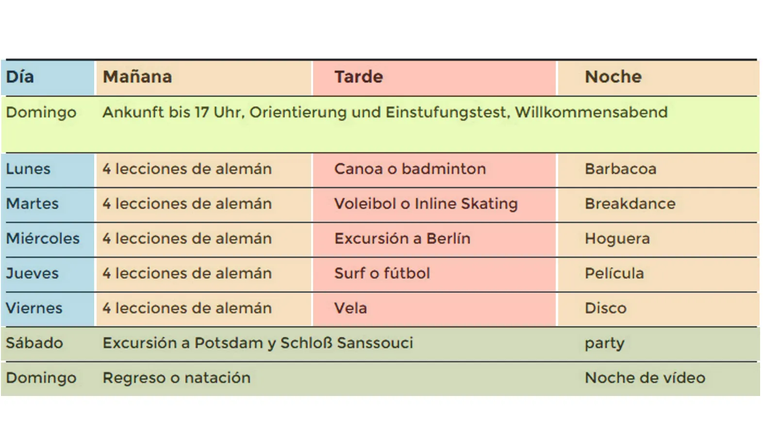 El programa consiste en 20 lecciones de clase de alemán a la semana, de lunes a viernes (4 lecciones diarias por las mañanas), en grupos reducidos de máximo 12 estudiantes por clase y con atención personalizada por parte de los profesores, para obtener el máximo provecho del curso. Las clases se imparten desde nivel elemental a avanzado. El ambiente es muy internacional con una buena mezcla de nacionalidades. Los profesores están muy preparados y motivados y el ambiente en el Campamento es muy familiar, ya que la propia residencia se encuentra dentro del recinto. Además, está a 30 kilómetros al sureste de Berlín, una ciudad ideal para visitar por su riqueza cultural y de gran interés turístico.